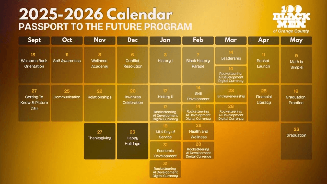 African-American males from 6th through 12th grade. Offered tuition-free by the 100 Black Men of Orange County, sessions are held every other Saturday throughout the school year, the Passport Program seeks to assist the transition of these students from adolescent boys to confident young men ready to successfully take on the challenges of college, career and community.